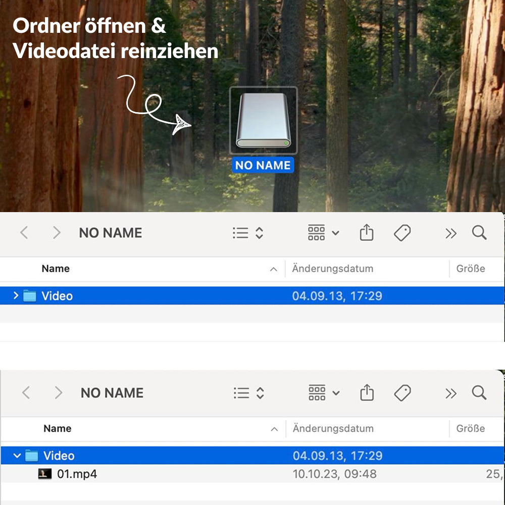 Öffne den Ordner der Karte und ziehe deine gewünschte Videodatei hinein.